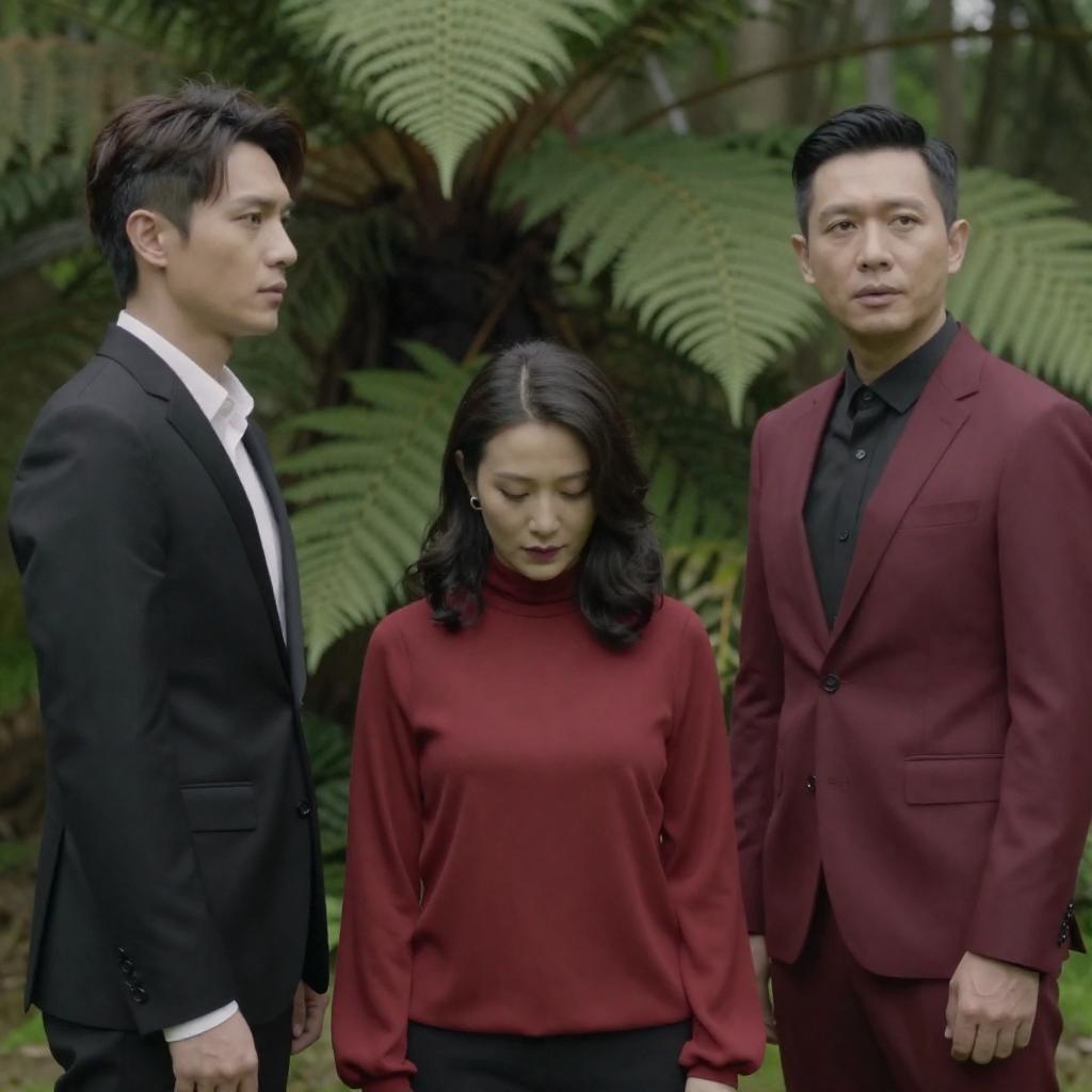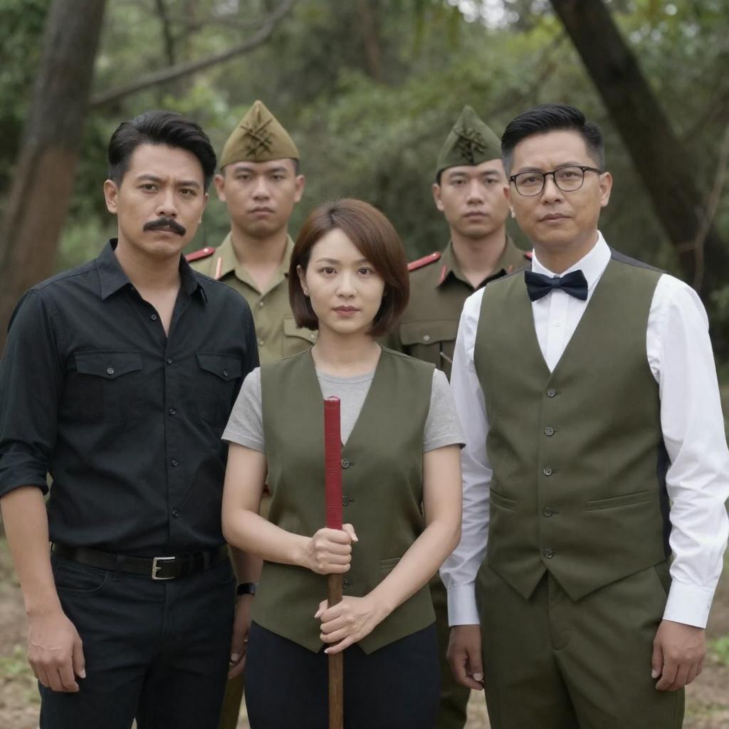Photograph of a group of five people in a forest. A man with dark hair and mustache in a black shirt stands left, a woman with short brown hair in a green vest holds a red-tipped stick, a man with glasses and a bow tie in a green vest stands right, and two men in military-style hats and vests are in the background.