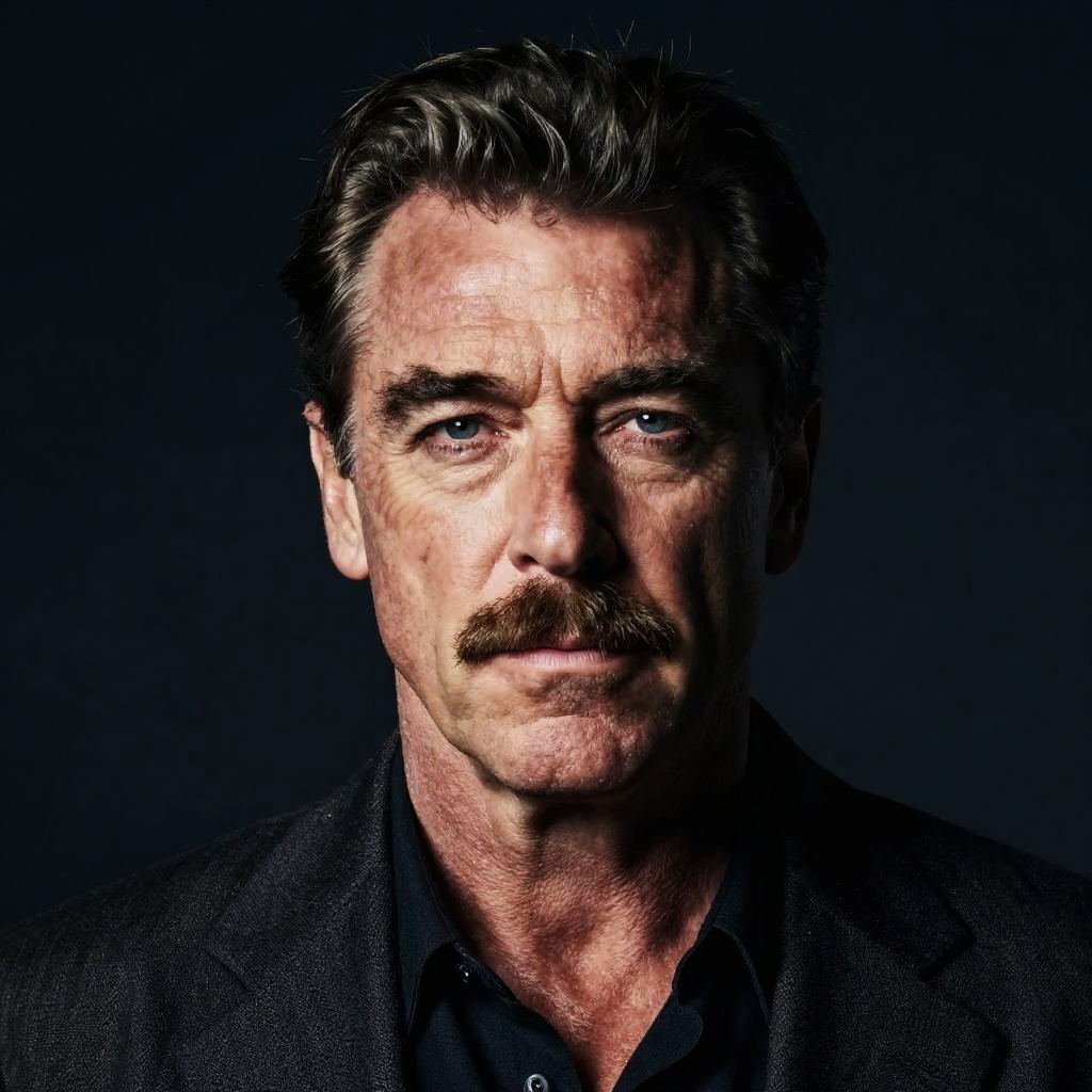 This is a high-contrast photograph of a middle-aged man with a rugged, handsome appearance. He has short, wavy, dark brown hair and a thick, well-groomed mustache. His blue eyes are slightly squinted, giving him a serious, intense look. He is wearing a black suit jacket over a black shirt. The lighting is dramatic, casting deep shadows on the right side of his face and highlighting the left side, creating a stark contrast. The background is completely black, making the subject stand out sharply. His skin is slightly weathered, adding to his rugged charm. The overall style is reminiscent of a studio portrait with a moody, dramatic feel.