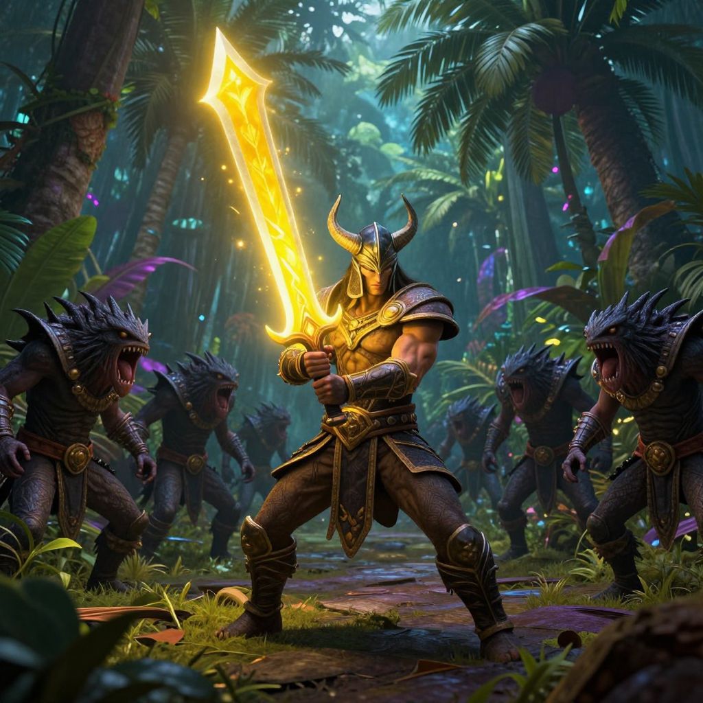 A muscular warrior wielding a magical yellow scythe stands in a tropical paradise, surrounded by an army of walking piranha men, creating a dynamic and colorful scene with intricate details.