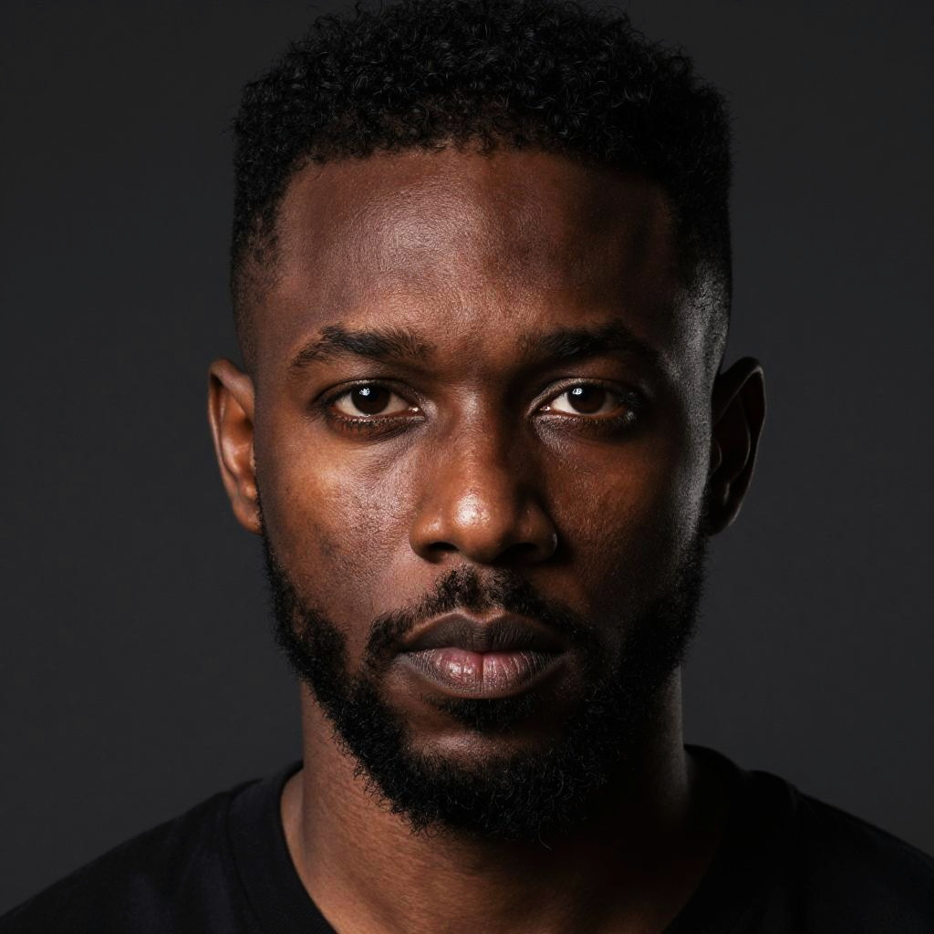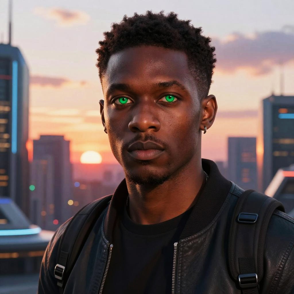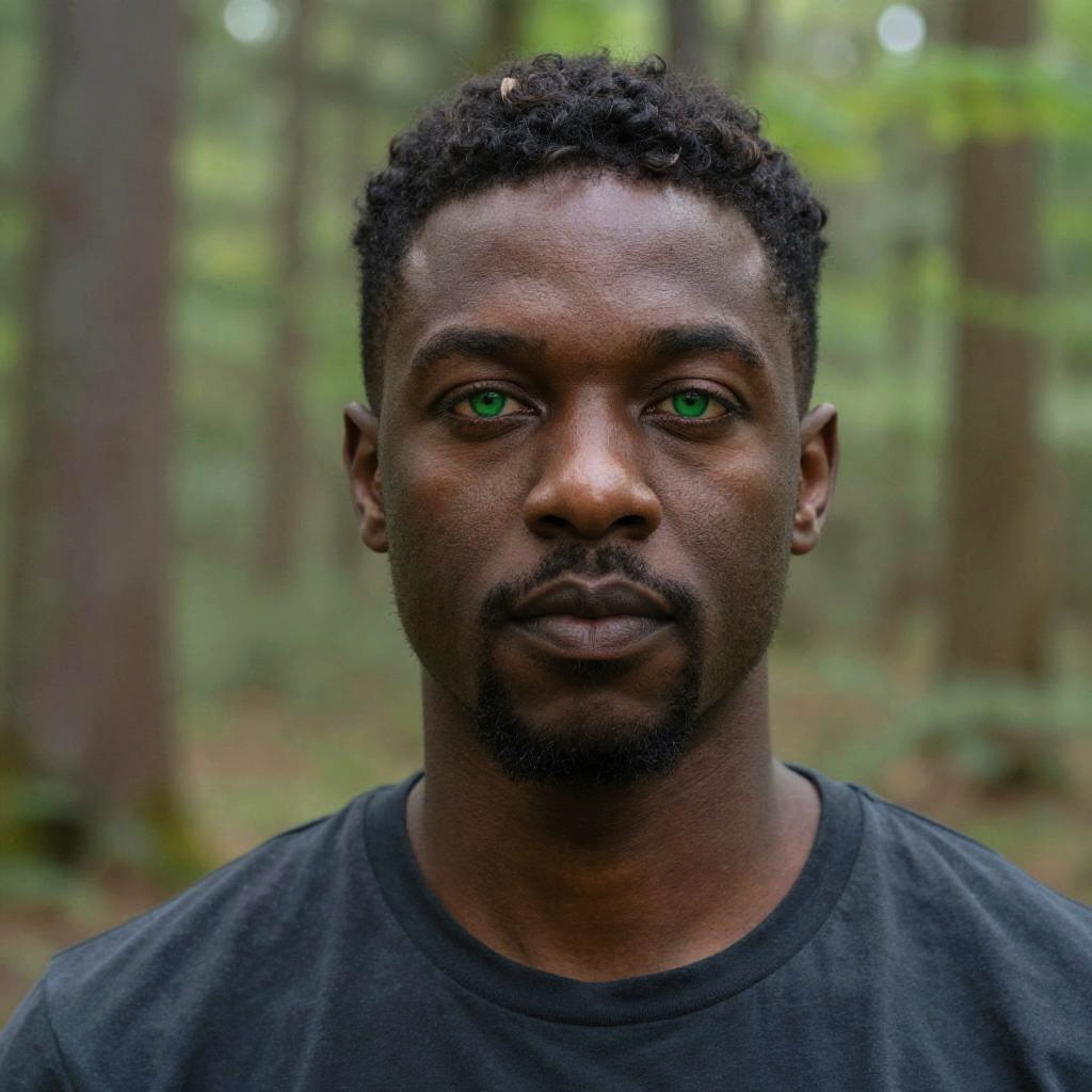 Black man with green eyes in a serene forest setting, soft natural light filtering through trees, peaceful expression, realistic portrait, fine details