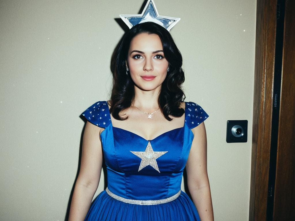 Photograph of a young woman with fair skin and dark brown, wavy hair, wearing a vibrant blue, star-patterned dress with a white star on the chest and blue, star-spangled sleeves. She has a silver tiara with a white star on her head and a silver necklace. She stands against a plain, beige wall with a wooden door frame on the right. The lighting is bright, creating a slight halo effect around her. Her expression is neutral, and the image has a slight vignette effect at the top and bottom edges.