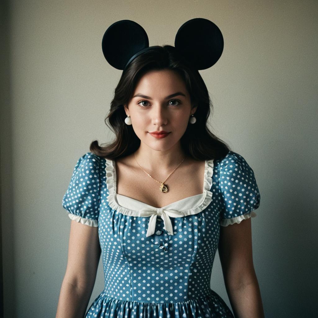 Photograph of a fair-skinned woman with dark wavy hair, wearing a blue star-themed dress with white star accents, silver belt, and star