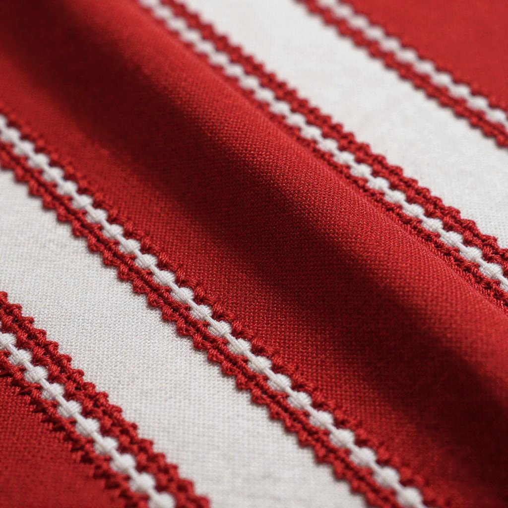 Ghutra fabric close-up showing detailed embroidery and texture, vibrant red and white colors, soft folds, realistic shadows, linen material, macro shot with high detail, artistic fashion photography style, natural light emphasizing fabric weave