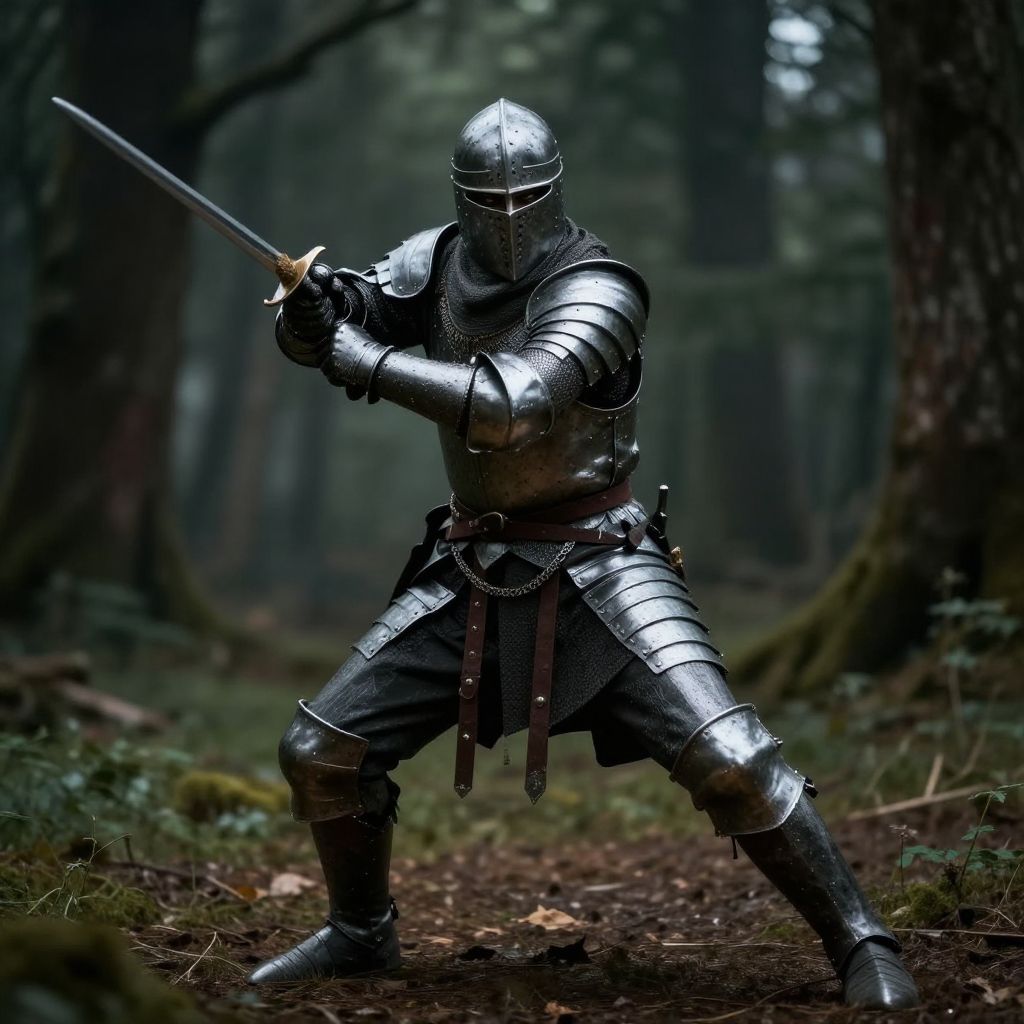 Sword fight stance in a medieval forest clearing, dramatic lighting, detailed armor, dynamic pose, intense expression, cinematic atmosphere, realistic style, high detail.