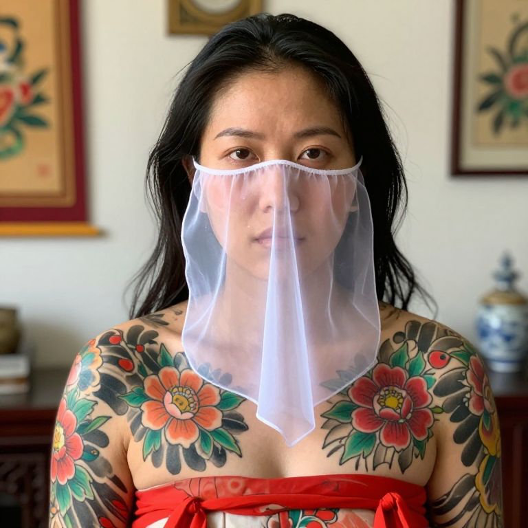 Photograph of an Asian woman with long black hair, wearing a sheer white face mask that covers her nose and mouth. She has vibrant, colorful tattoos of large flowers with red, orange, and yellow petals on her shoulders and upper chest. She is dressed in a red strapless top. The background includes framed floral paintings on a white wall, with a dark wooden cabinet and a blue and white porcelain vase partially visible. The lighting is bright, highlighting her tattoos and the transparency of the mask.