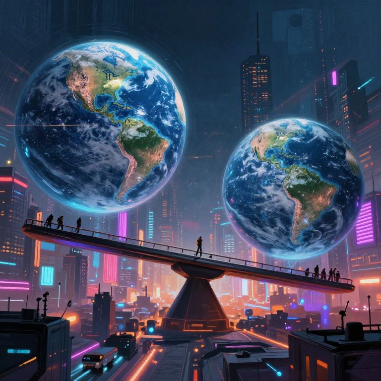 Digital artwork: Two giant, floating Earths in a neon-lit, futuristic cityscape with a high-tech, suspended walkway and tiny figures standing