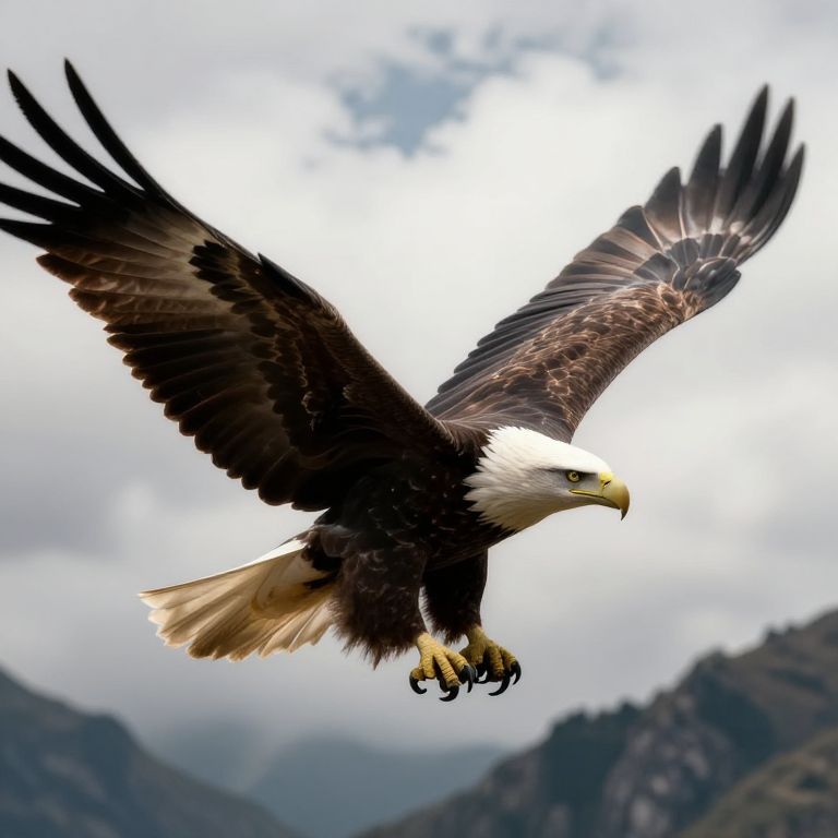Photograph of a majestic bald eagle in mid-flight against a cloudy sky. The eagle's white head and yellow beak contrast with its dark brown body and wings, which are spread wide. Its sharp talons are visible, clutching the air. The background features a blurred, mountainous landscape with green and brown hues. The eagle's feathers are detailed, showing texture and depth, while the sunlight highlights its wings, creating a dynamic and powerful image.