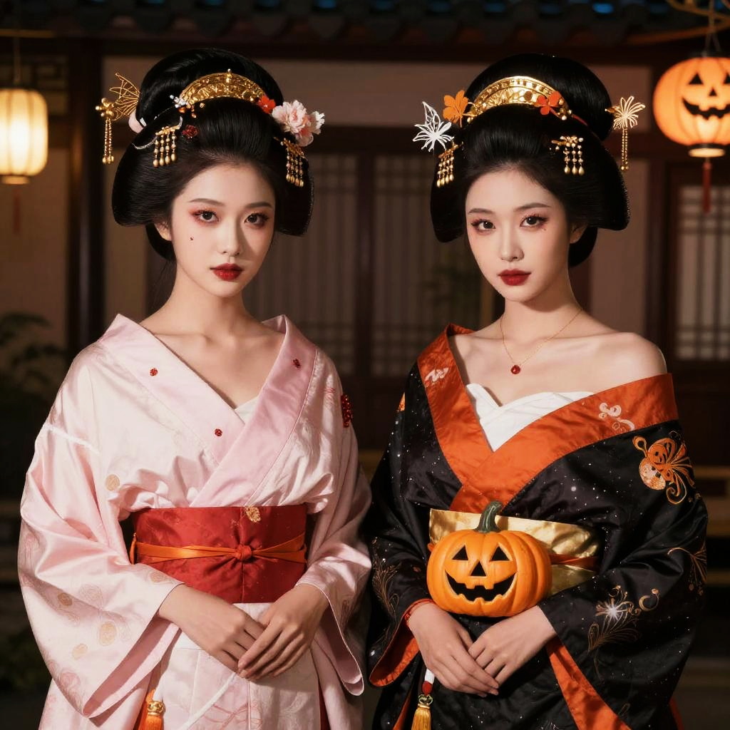 RAW, Professional Portrait, [ Alex Newell | Tiffany Mynx ], Halloween geisha costume, perfect composition, high detail, hyper realistic, extremely detailed
