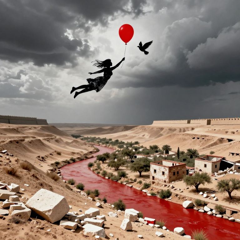 A digital art image depicts a silhouette of a woman with long hair and a balloon flying above a desert landscape. She holds a red balloon against a dramatic, cloudy sky. Below, a red river cuts through sandy hills dotted with small white buildings and palm trees. Two large, beige, fortress-like structures stand on the horizon. The contrast between the dark clouds and bright red river creates a striking visual. The woman's silhouette is detailed, with flowing hair and outstretched arms, adding a sense of motion and freedom to the scene.