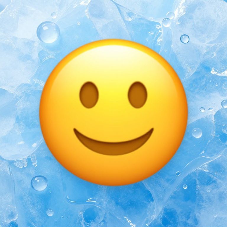 Digital illustration of a bright yellow, circular smiley face emoji with simple, brown, oval eyes and a curved brown smile. The background features a textured, icy blue pattern with white frost-like streaks and small water droplets, creating a cold, wintery feel. The emoji is centered and stands out prominently against the blue background. The overall style is whimsical and playful, with a clean, modern digital aesthetic.