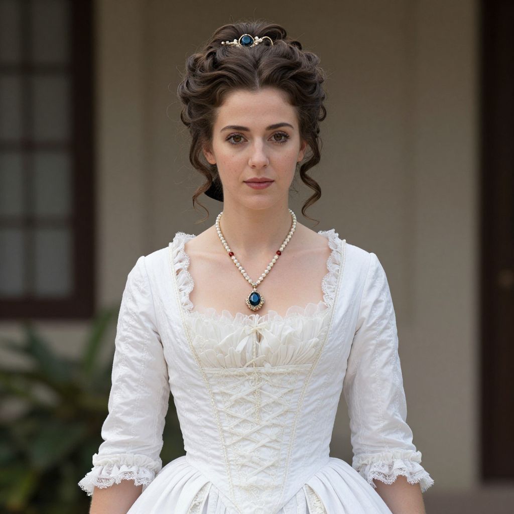 Photograph of a young woman with fair skin and dark, wavy hair styled in an updo with small hairpins. She wears a white, Victorian-style, long-sleeved dress with lace trim on the sleeves and a fitted bodice. The dress has a deep square neckline, adorned with a pearl necklace featuring a large blue gemstone pendant. Her makeup is subtle, with dark eyeliner and pink lipstick. The background is blurred, showing a window with dark frames and a green plant on the left. The lighting is natural, highlighting her elegant and historical appearance.