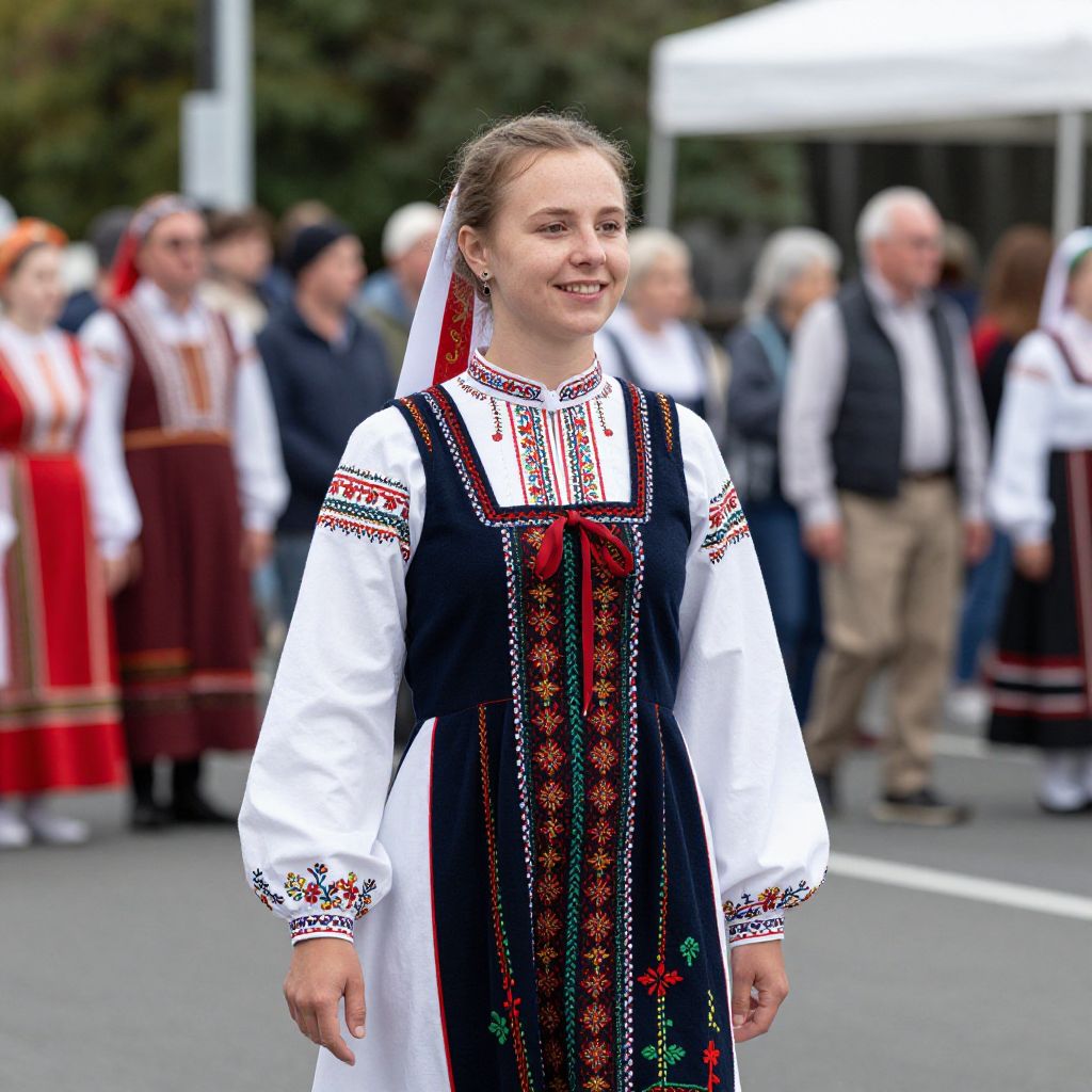Photograph of a young Caucasian girl with light brown hair in a traditional Eastern European folk costume. She wears a black embroidered dress over a white blouse with intricate red and green patterns, and a red headscarf. She smiles, standing on a street with a blurred crowd in similar attire in the background. The background includes green trees and a white tent. The image captures a vibrant cultural festival scene with a focus on traditional clothing and community.