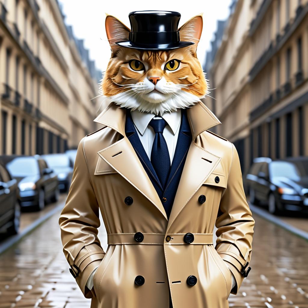 Anthropomorphic cat in a stylish trench coat, highly detailed and styled with a professional and formal look.
