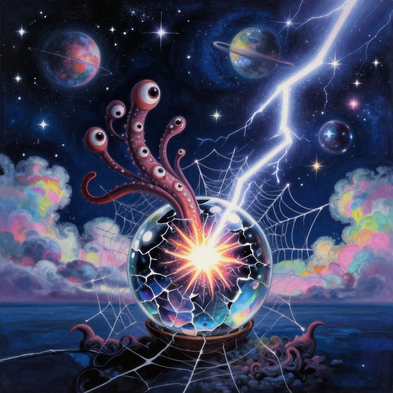 Digital artwork of a glowing, cracked glass orb with octopus tentacles, lightning bolt, and cosmic background with colorful planets and stars.
