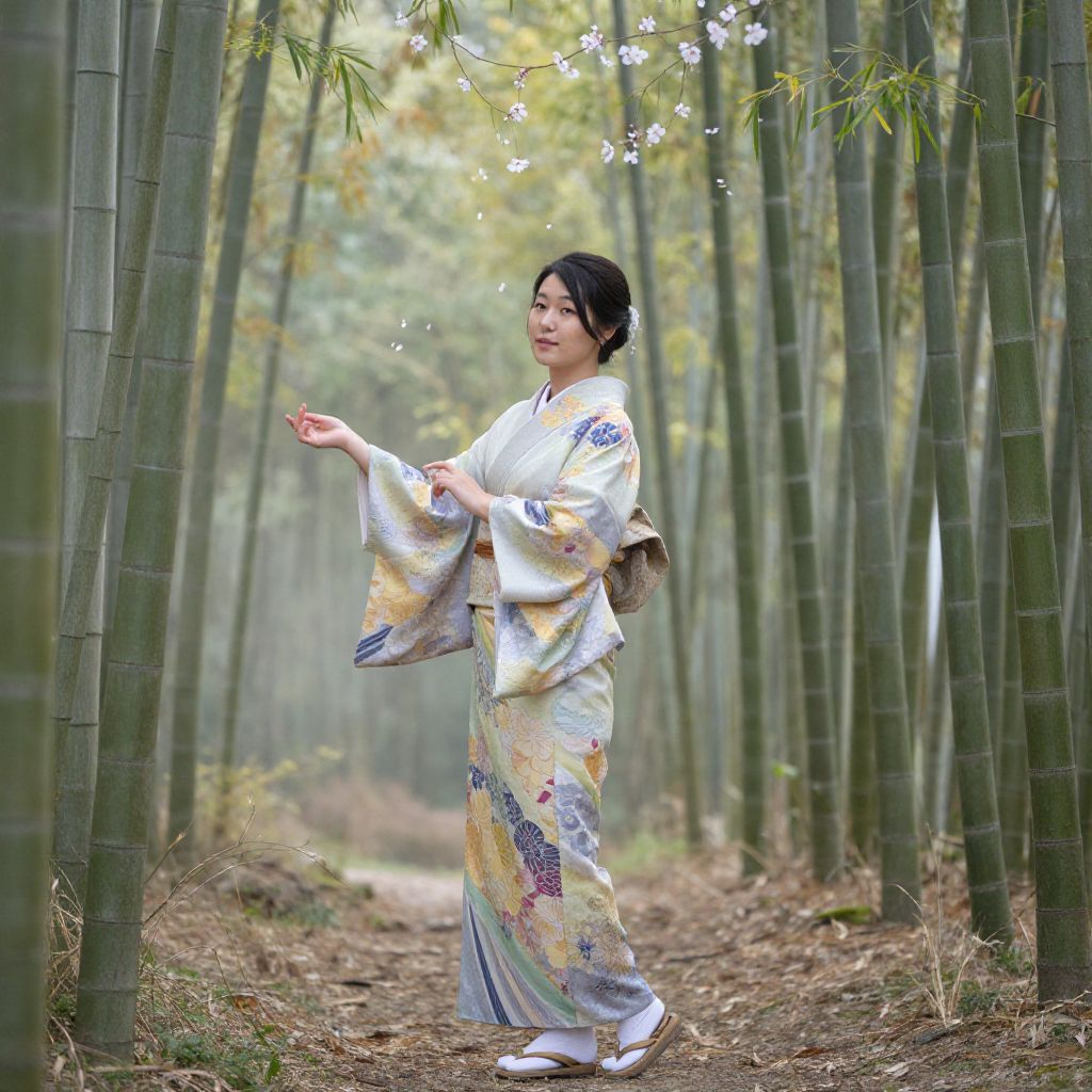 Tall Japanese woman standing gracefully in a serene bamboo forest during early morning mist, wearing a flowing traditional kimono with intricate patterns, soft natural light filtering through the leaves, delicate cherry blossoms floating gently around her.