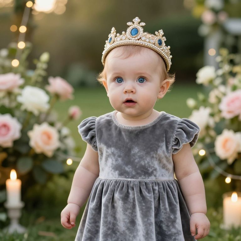 An adorable infant dressed in a royal crown and velvet gown for a christening party, standing in a candlelit garden with blooming roses and fairy lights, face full of wonder and curiosity, wide blue eyes, fair skin, and delicate features, soft golden hour lighting, natural and authentic baby photo