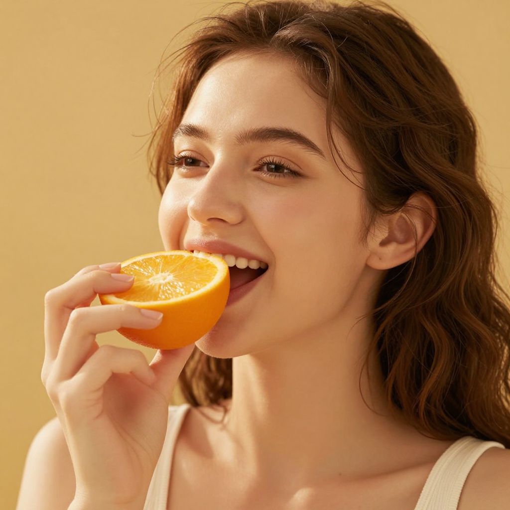 Photograph of a young woman with light skin and long, wavy brown hair, smiling while holding a half orange in front of her mouth. She has dark brown eyes and is wearing a white sleeveless top. The background is softly blurred with warm, golden sunlight, suggesting an outdoor setting. Her hands are gently gripping the orange, and her teeth are visible as she takes a bite. The image captures a sense of freshness and joy, with the vibrant orange contrasting against her fair complexion.