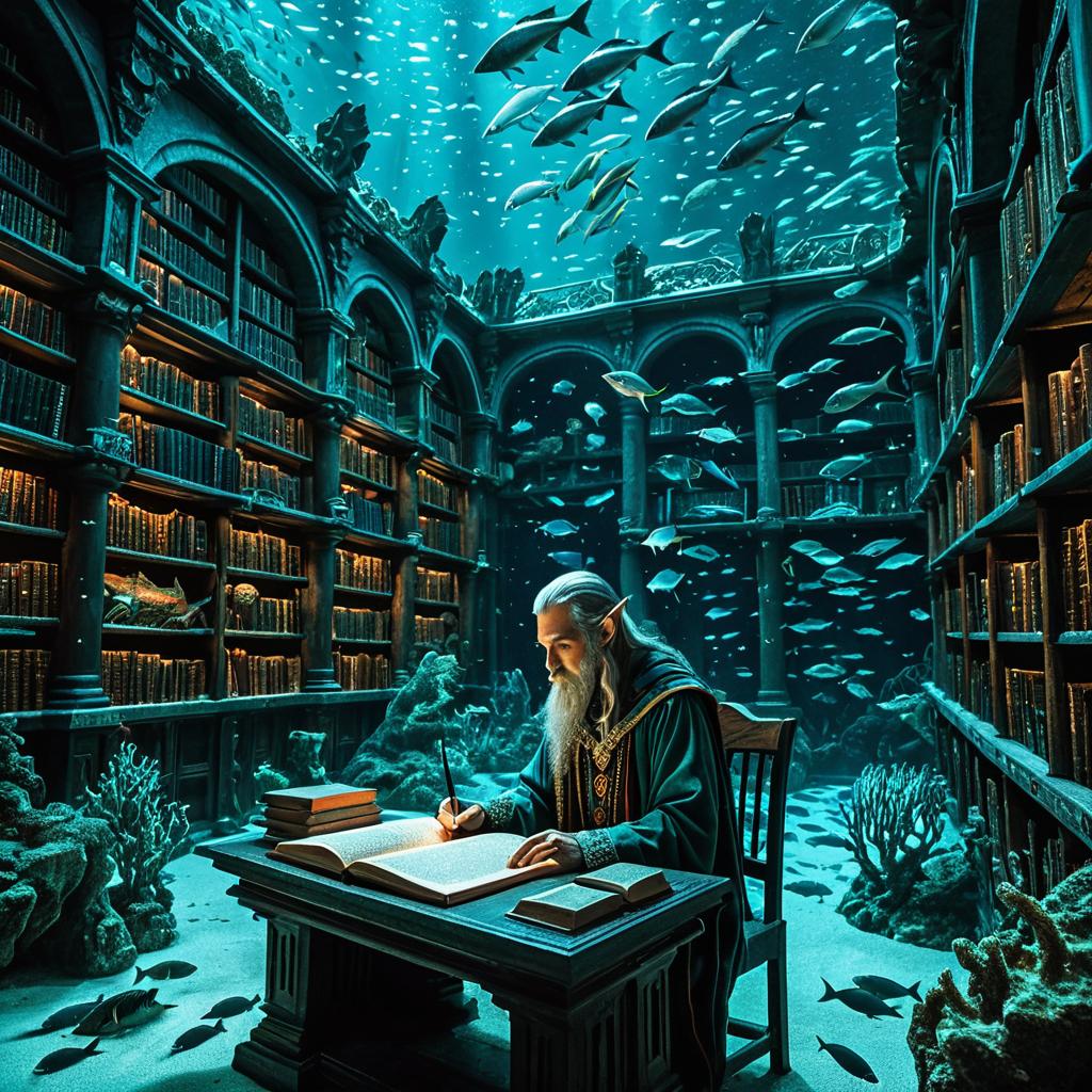 A fantasy scene featuring an elven scholar with long silver hair and intricate robes, kneeling in an ancient stone amphitheater. The elf studies etched stone tablets engraved with magical runes, while snaking vines emit sparks of magic. The ambient lighting creates a fiery twilight haze, emphasizing the mystical and atmospheric high fantasy setting.