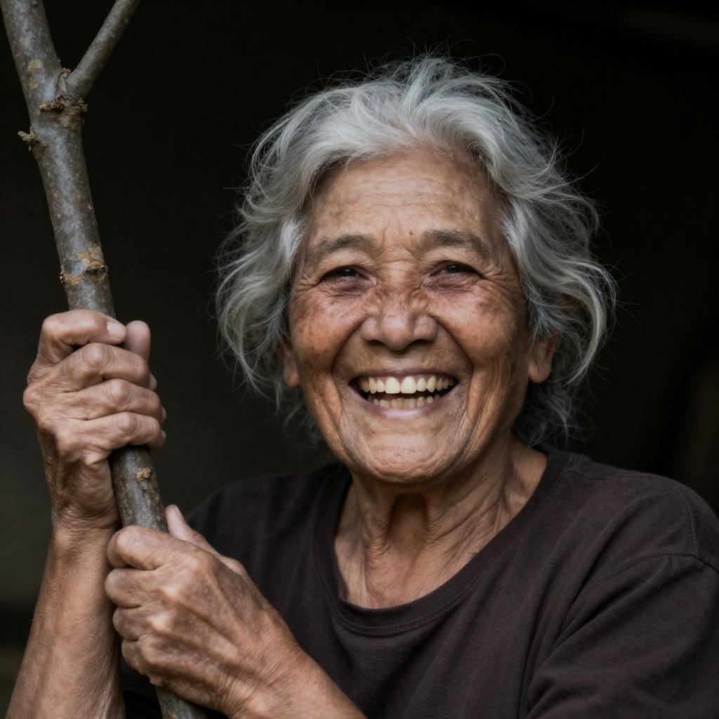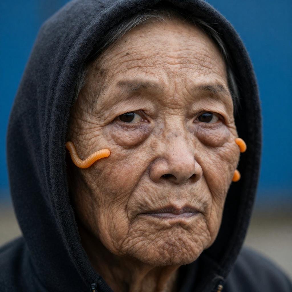 Close-up photograph of an elderly person with a wrinkled face, wearing a dark hooded garment. Their face is covered in numerous orange worms. Intense, hollow eyes. Blue blurred background. One person. Textured skin, detailed wrinkles.