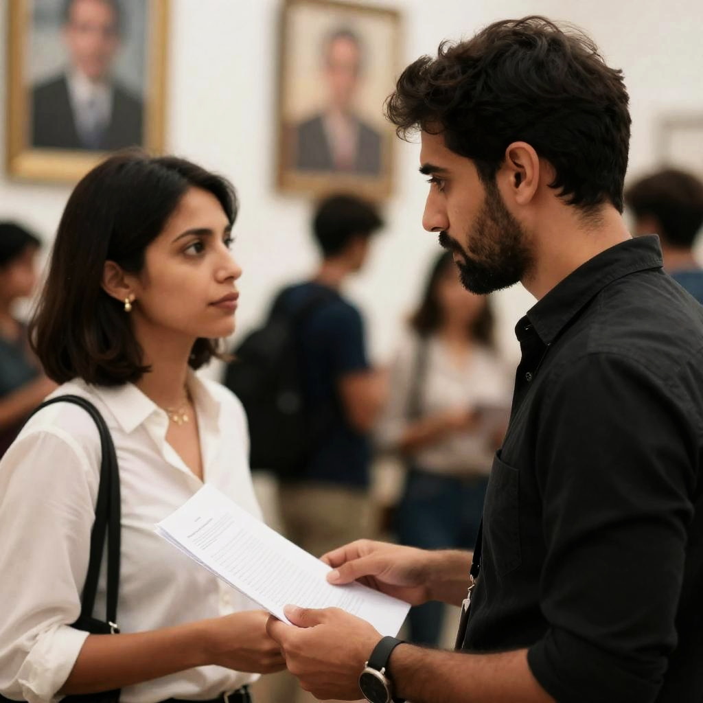 Photograph of a man with thinning hair playing a flute, wrapped in a colorful striped shawl, sitting next to a woman with long black hair, wearing a patterned dress. Background has a dimly lit room with shelves of books and several people watching. Man's intense focus, woman's attentive expression. Microphone on the left.