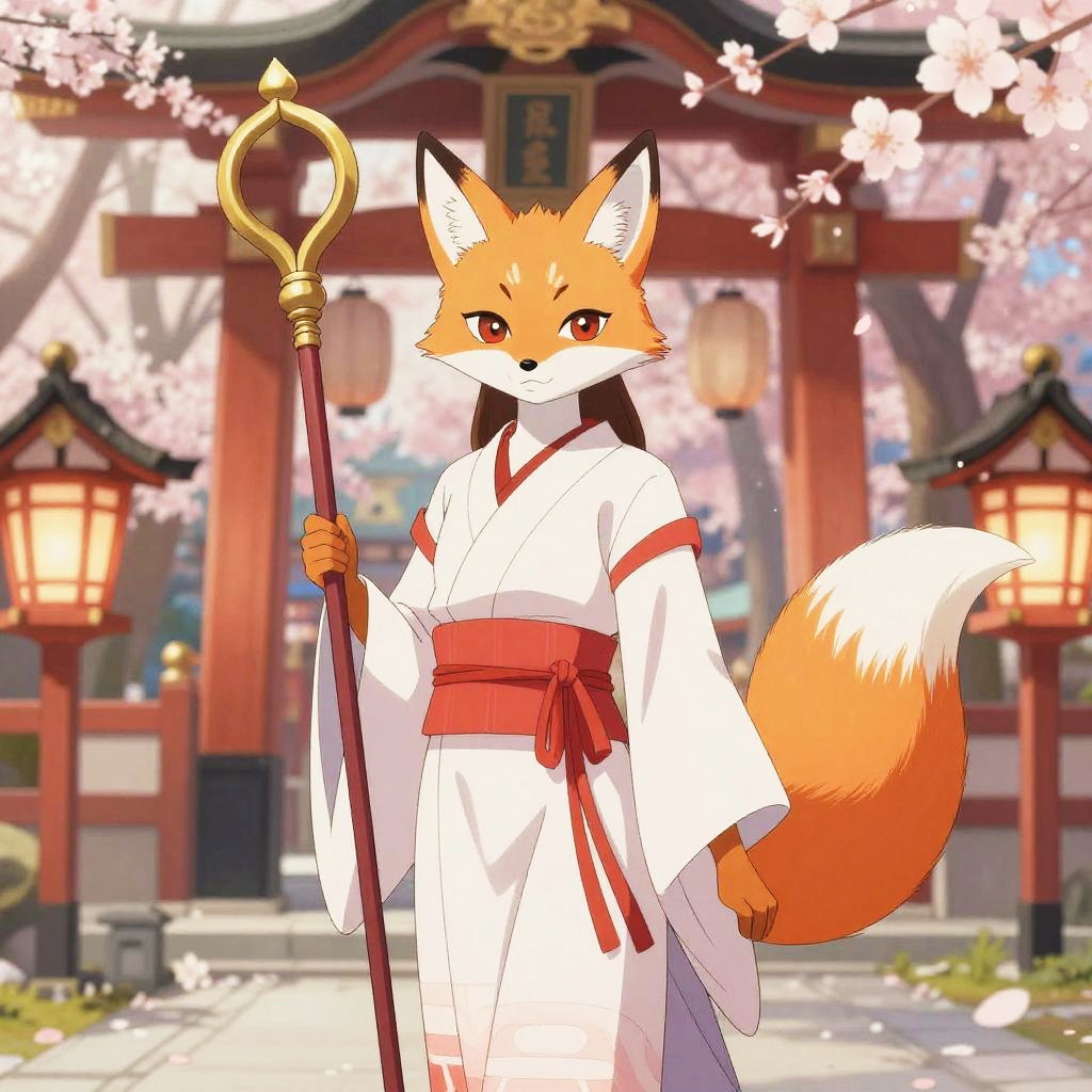 Digital anime-style illustration of a fox anthropomorph in a white kimono with red sash, holding a staff, standing in front of a cherry