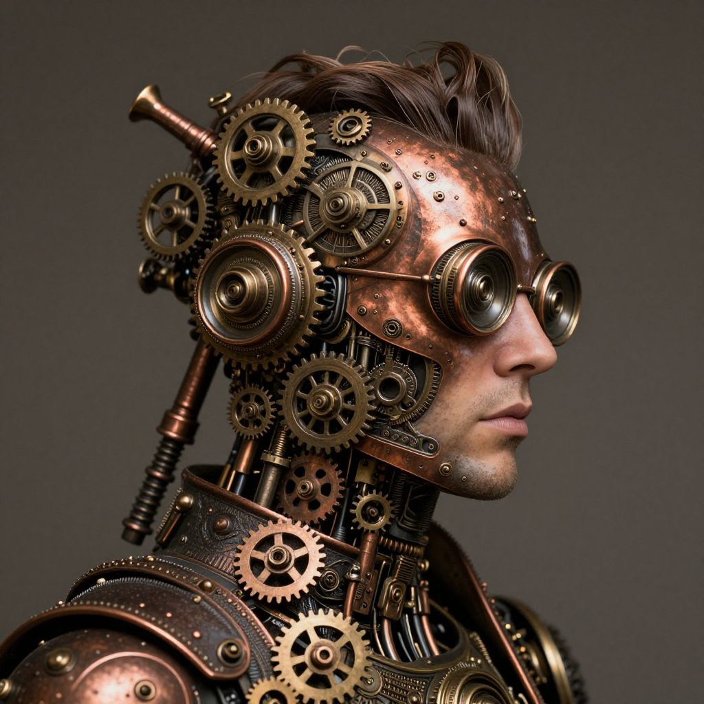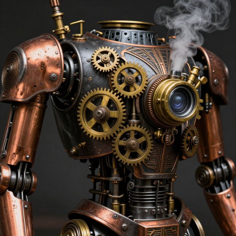 Close-up portrait of a dieselpunk robot with intricate brass gears and pistons, steam rising from vents, worn metal surfaces with scratches and oil stains, copper and dark steel textures, art deco influence in design patterns, dramatic lighting