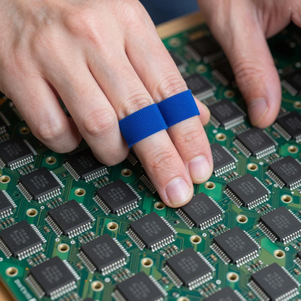 Hand with two blue jumpers on fingers rests on densely packed circuit board with rows of black IC chips, green traces, and white solder points. Two blurry hands in background. Close-up.