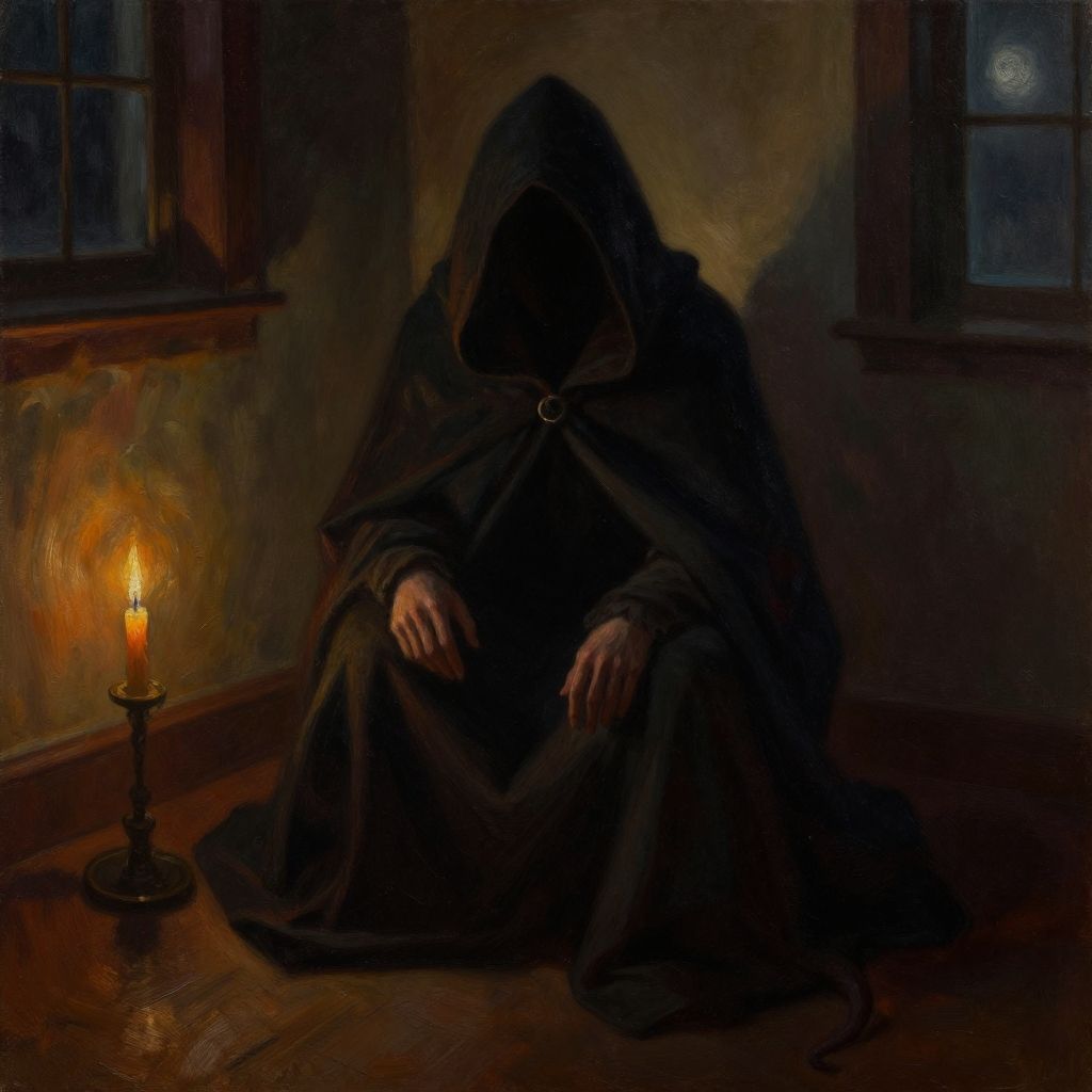 A dark, digital painting depicting a hooded figure sitting on a wooden floor in a dimly lit room. The figure's face is obscured by the hood, and only their hands are visible, resting on their lap. A single, lit candle on a small stand casts a warm, flickering glow to the left. The background features two small, dark windows with faint moonlight filtering through. The walls are textured and painted in muted, dark colors, adding to the eerie, mysterious atmosphere. The overall mood is somber and enigmatic.