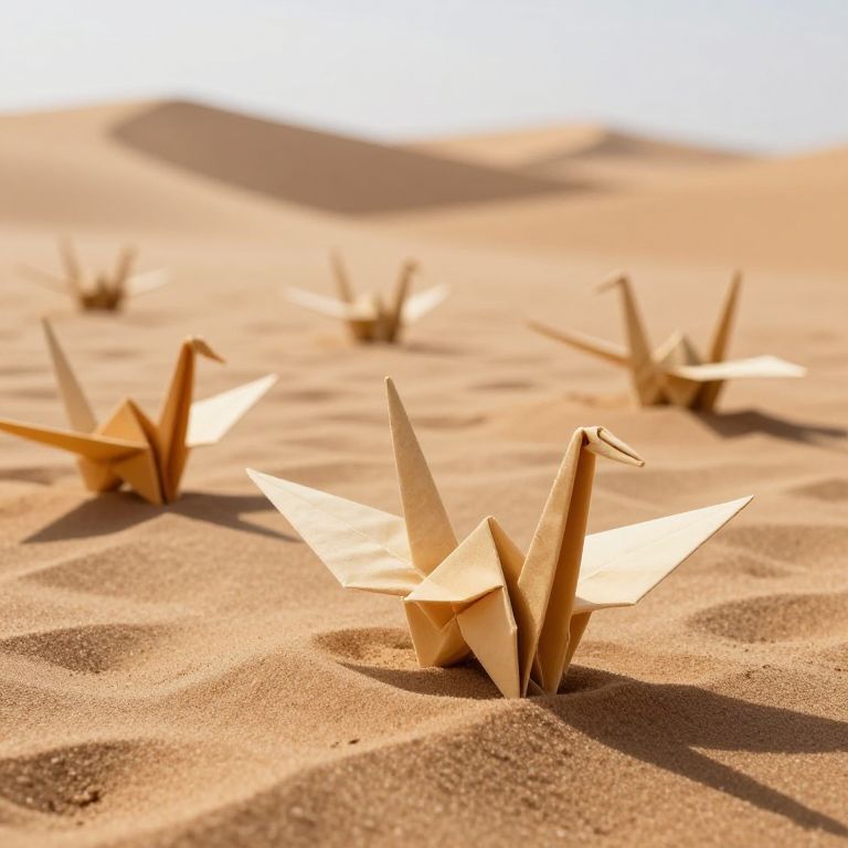 An ancient desert is alive with unfolding origami cranes made of sand, each one revealing new intricate details as wind whispers through the dunes.