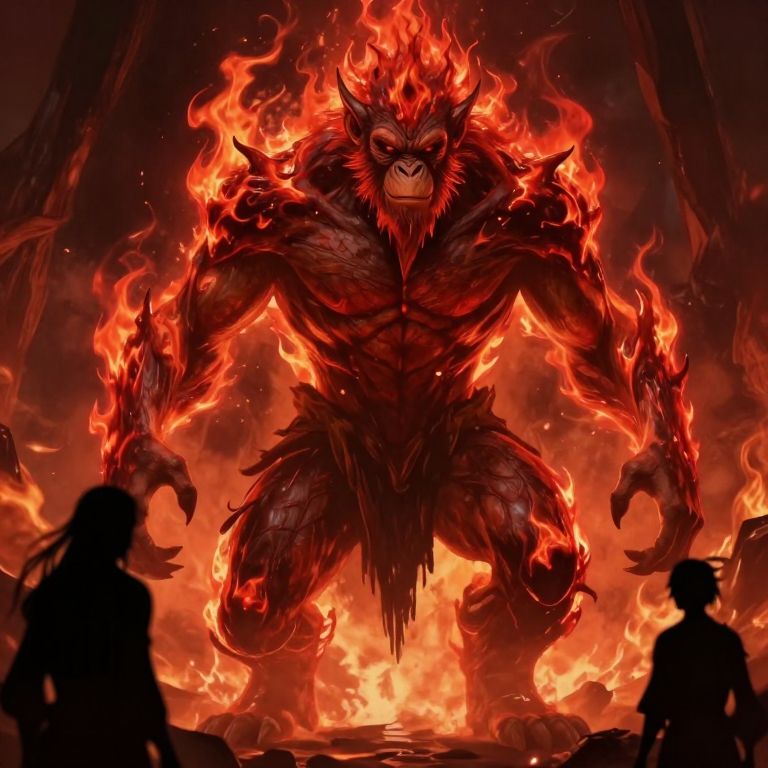 The image depicts a massive, humanoid demon standing on all four legs, with an ape-like appearance. The demon has dark skin, a thick mane, and flaming skin that glows with an intense red hue. Its muscular build is accentuated by the fiery aura surrounding it, giving it an imposing and menacing presence. The demon's eyes are glowing red, adding to its malevolent appearance. In the foreground, there are two silhouetted figures, one with long hair and the other with short hair, standing near the demon's feet. The overall scene is set against a dark, fiery background, creating a sense of depth and scale. The digital drawing style enhances the fantastical and otherworldly atmosphere of the image, with intricate details and dynamic lighting that bring the scene to life.