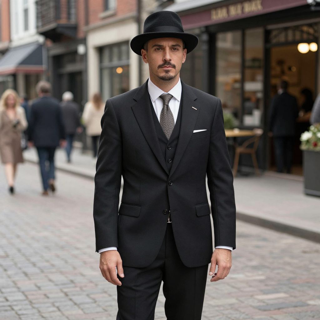 Photograph of a handsome man standing on a cobblestone street in an urban setting. He has a light olive skin tone, a trimmed mustache, and dark eyebrows. He wears a black fedora, black three-piece suit with a white dress shirt, and a patterned tie. The suit is well-tailored, and a white pocket square peeks out. In the background, there are blurred pedestrians and storefronts, including a restaurant with a maroon sign. The street is lined with brick buildings and there is a large planter with flowers to the right. The overall style is sophisticated and stylish.