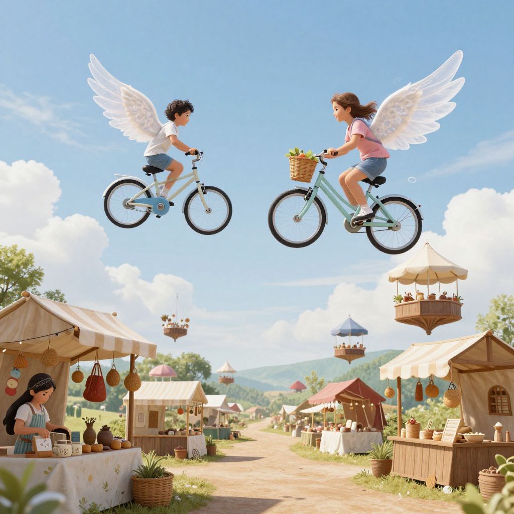 Children with ethereal wings soar gracefully on bicycles through a whimsical sky, navigating between floating market stalls that dangle serenely above a quaint town.