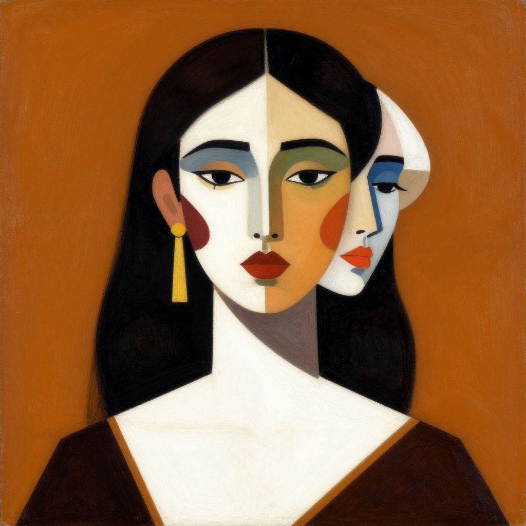 "Dedication a portrait, of a woman with colorful faces, in the style of geometric harmony, orientalism, dark amber and white, bold and contrasting colors, bold lines and contrasts,"