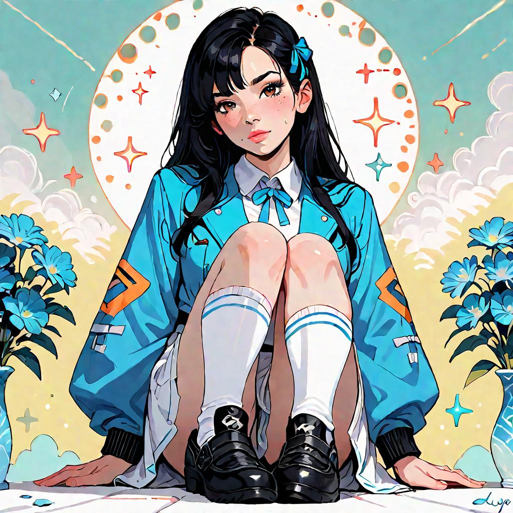 (score_9, score_8_up, score_7_up), green eyes, black hair, long hair, hair ribbon, white shirt, blue jacket, white skirt, white socks, black footwear, seducing viewer, suggestive pose