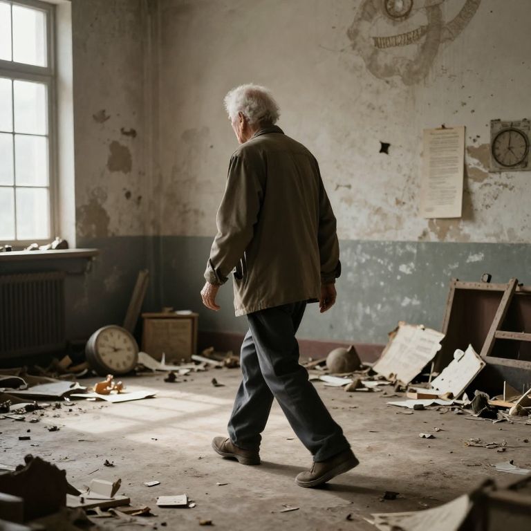In a room steeped in the weight of time, an elderly figure walks backward amidst scattered remnants of creation, embodying the paradoxical dance between memory and progress, where each step echoes the relentless march of time yet carries the quiet rebellion of a soul questioning its own narrative.