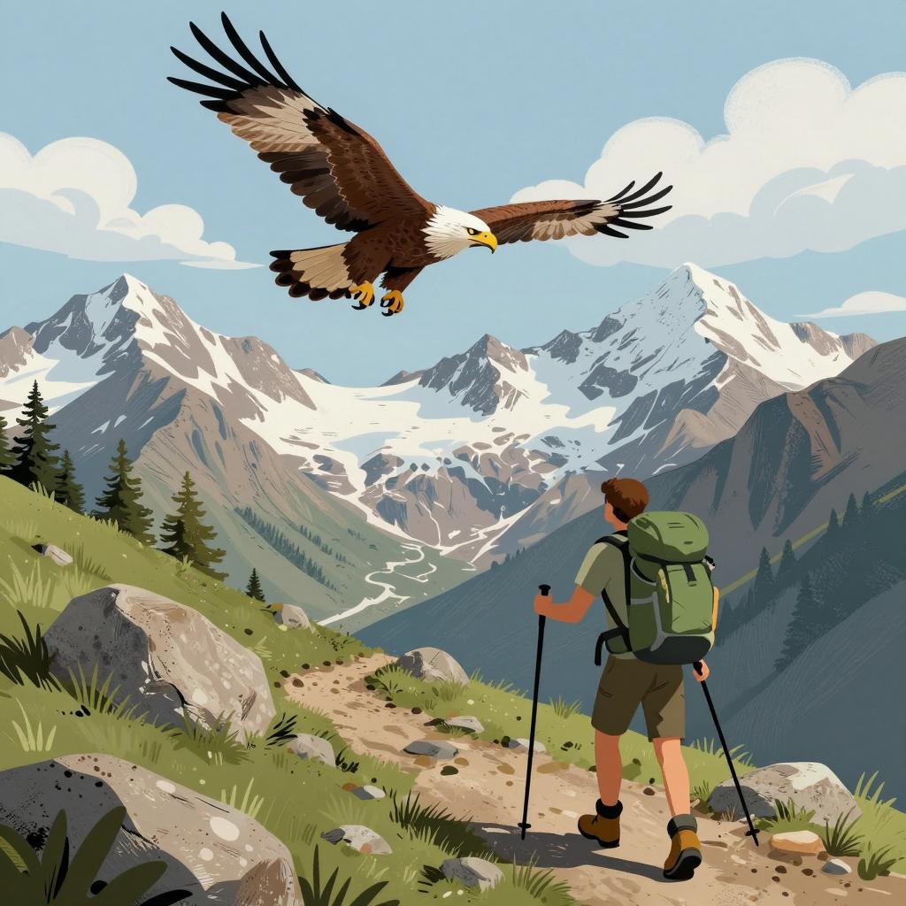 Illustration of a hiker with trekking poles and a green backpack walking on a rocky mountain trail. A large eagle soars above snow-capped, rugged mountains under a blue sky with clouds. The scene features natural earthy tones and rough sketch textures.