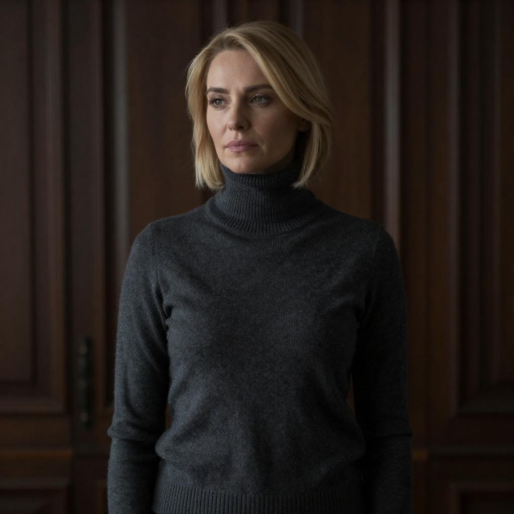 Photograph of a blonde woman with a side part, wearing a dark gray ribbed turtleneck sweater, standing in a dimly lit room with large windows in the background. She has a neutral expression, looking slightly to her right. Blurred furniture and objects are in the background. Soft light from windows illuminates her face.