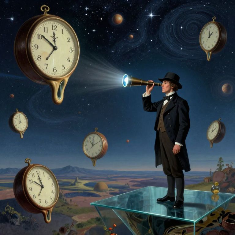 Vintage-suited man in top hat gazes through telescope at floating clocks against a starry, cosmic landscape on a glass platform.