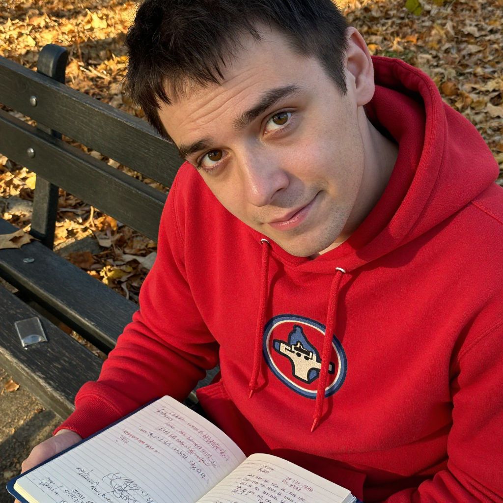 A close-up of a man with deep-set eyes and a slightly crooked smile, wearing a red hoodie with a vintage band logo, sitting on a park bench in autumn, surrounded by fallen leaves and a half-finished notebook with scribbled song titles and chord progressions, the golden hour light casting soft shadows.