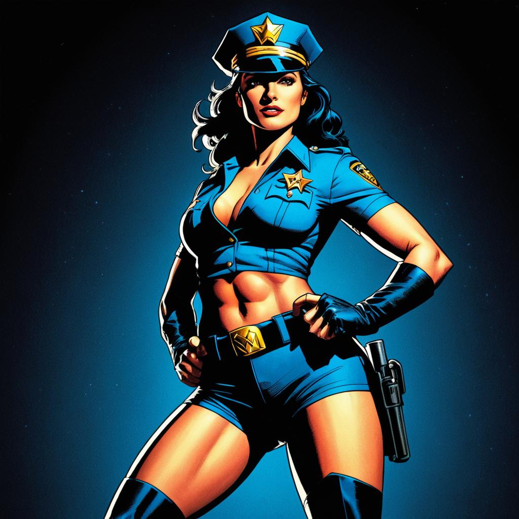 A beat cop from DC Comics inspired by Don Quixote with a determined expression, Marvel comic dynamic pose, low angle shot, flat colors, comic art style inspired by Andy Kubert, vector shadows, neon lights.