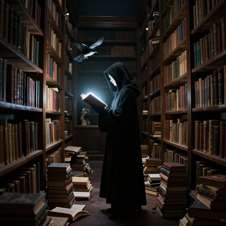 In a dimly lit labyrinthine library where ancient books overflow and spill onto the floor, a cloaked figure holds a glowing tome as a bird takes flight, symbolizing the elusive escape of knowledge into the ethereal night.