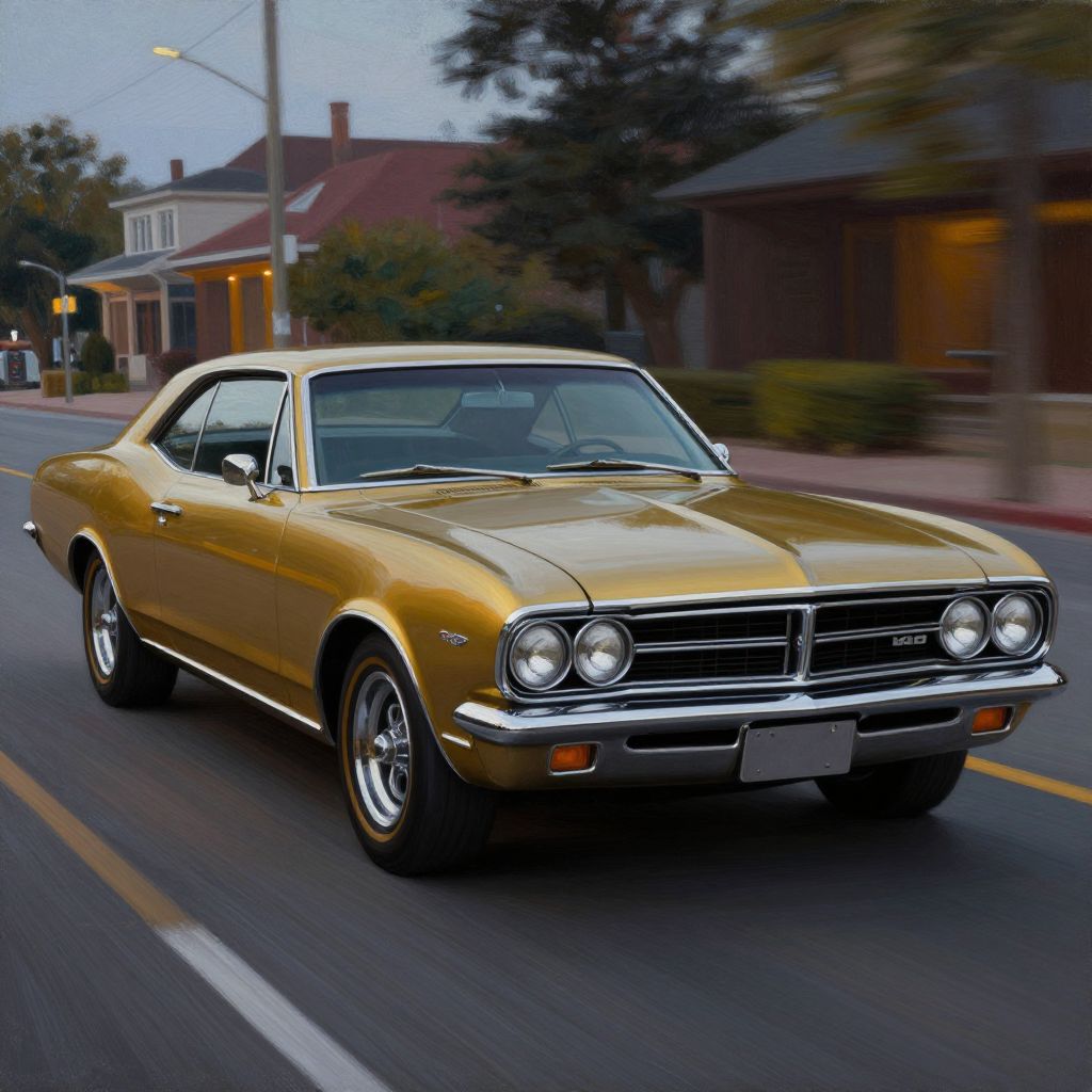 A nostalgically crafted relic of the past, a meticulously restored deep bronze pearlescent classic 60's muscle car cruises through the dusk streets with an intimidating elegance, The vintage vehicle gleams with a lustrous sheen, showcasing its aerodynamic lines and sharp accents as it cruises along the asphalt, This evocative scene is captured in a vividly detailed oil painting, where every brushstroke highlights the car's classic styling and pristine condition, Impeccably rendered, this image transports viewers to a bygone era of automotive luxury and style, secretlab