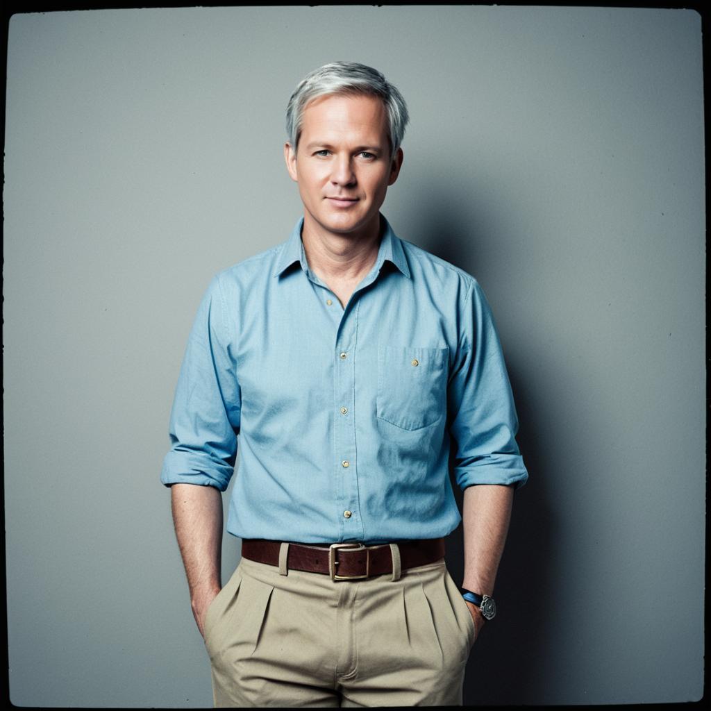 Self cosplay costume, I Am Because We Are Paul Farmer wearing light blue casual shirt, khaki pants, short gray hair, intellectual charismatic look, vignetting