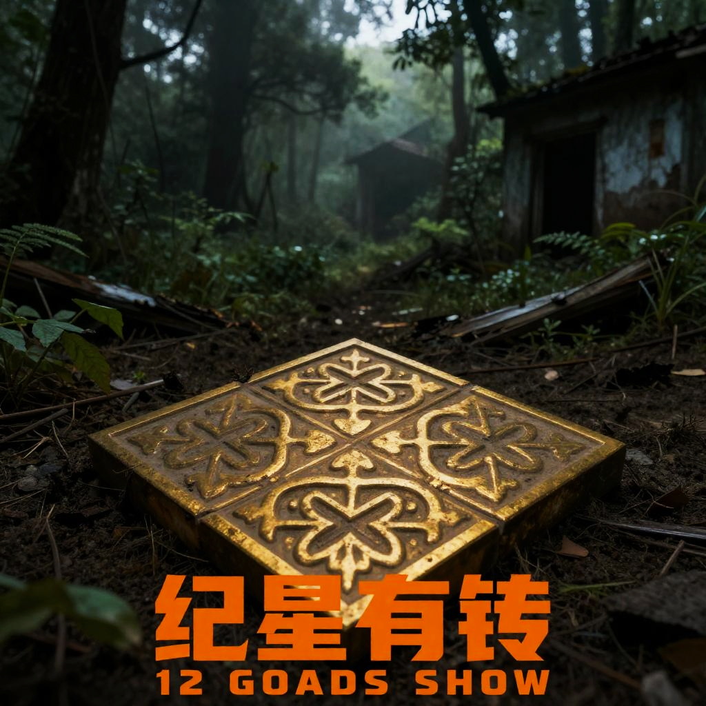 Misty and abandoned forest scene featuring a large golden patterned tile partially buried in dirt in the foreground. Background shows overgrown plants, broken structures, and a dilapidated building. Bold orange Chinese characters and the text "12 GOADS SHOW" appear at the bottom, creating a mysterious movie poster vibe.