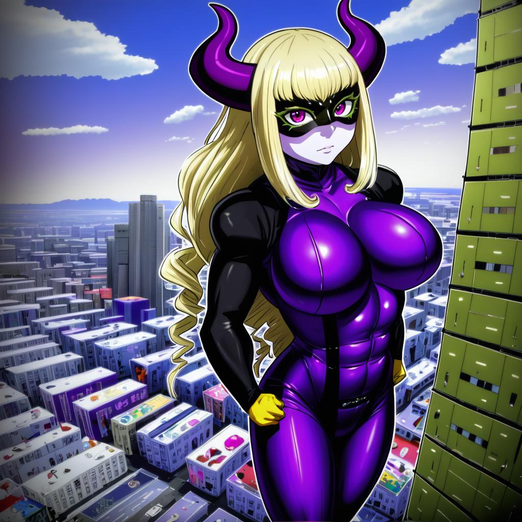Mount lady, boku no hero academia, 1girl, giantess, horns, purple horns, red eyes, purple eyes, blonde hair, long hair, drill hair, large breasts, ass, domino mask, bodysuit, superhero costume, superhero costume, by artist chanta (ayatakaoisii), anime