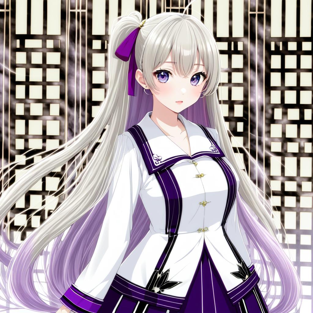 Digital anime-style illustration of a young girl with very long white hair tied in a side ponytail with a black ribbon. She has striking purple eyes visible through her bangs, light skin, and is dressed in a white and purple outfit inspired by Japanese school uniforms. The background features a green window grid with a soft light ambiance.