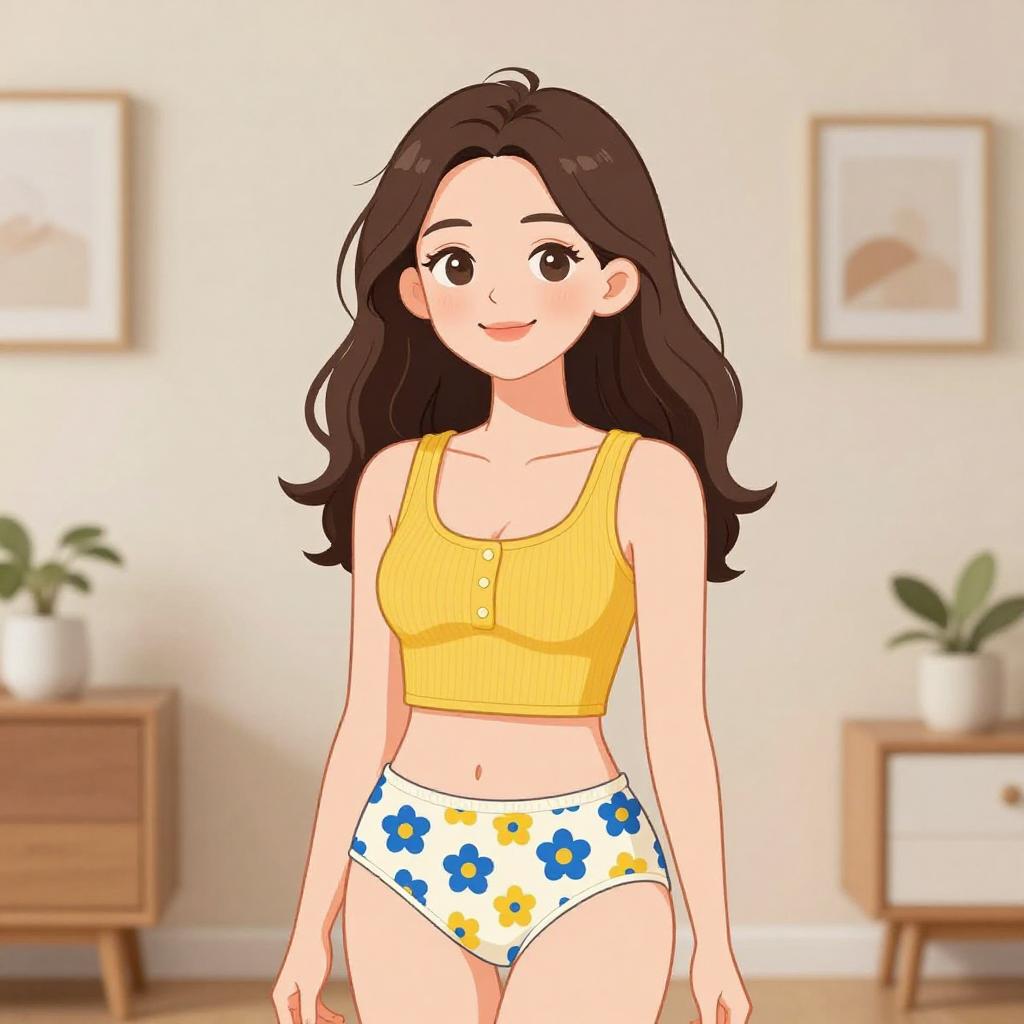 Digital anime-style drawing of a young woman with fair skin and long, dark brown hair. She wears a yellow, sleeveless crop top with a button down the front and white panties with blue and yellow floral patterns. She has large, expressive brown eyes and a slight smile. The background is a softly blurred, modern living room with beige walls, two framed pictures, and two wooden furniture pieces with green plants. The image has a bright, clean, and cheerful aesthetic.