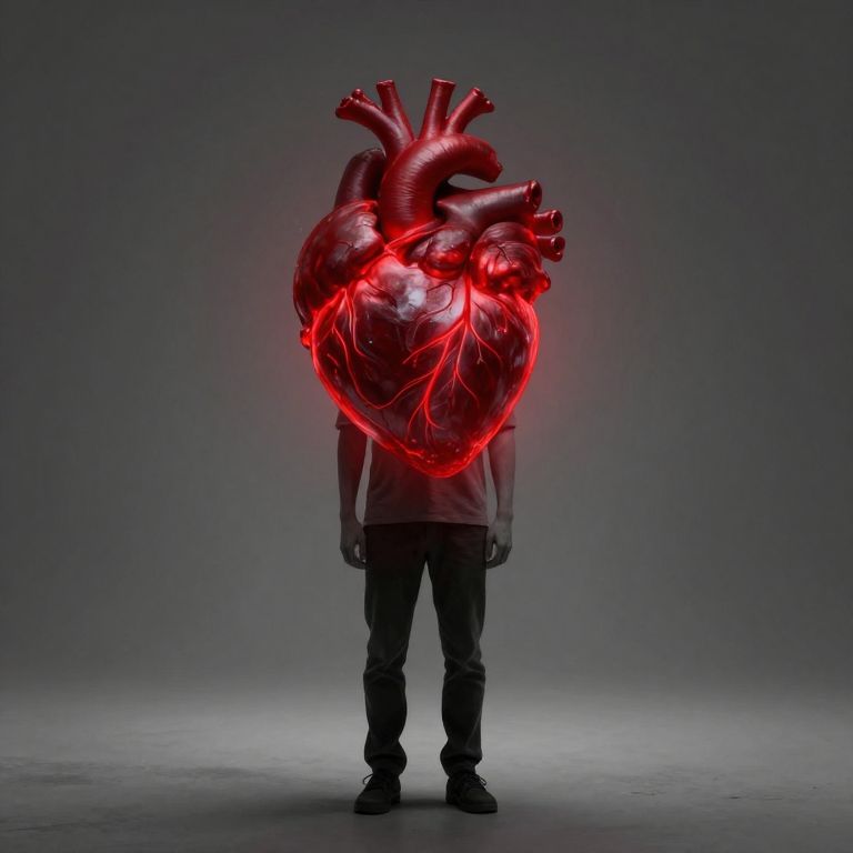 Photograph of a person standing against a dark gray, gradient background. The individual, dressed in a black shirt and pants, has their head replaced with a glowing, detailed, red, three-dimensional human heart. The heart's arteries and veins are clearly visible, with bright red light emanating from the center. The heart's texture appears realistic and slightly glossy. The person's face is obscured by the heart, and their posture is straight and neutral. The lighting highlights the heart's luminescence while casting subtle shadows on the floor. The overall style is surreal and dramatic.