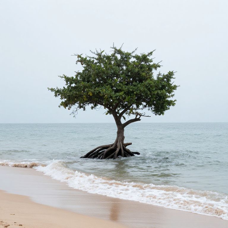 Serenity whispers through the gentle waves lapping against the sandy shores of a solitary island, where a resilient tree stands as a symbol of enduring life amidst the vast, silent expanse of the ocean.