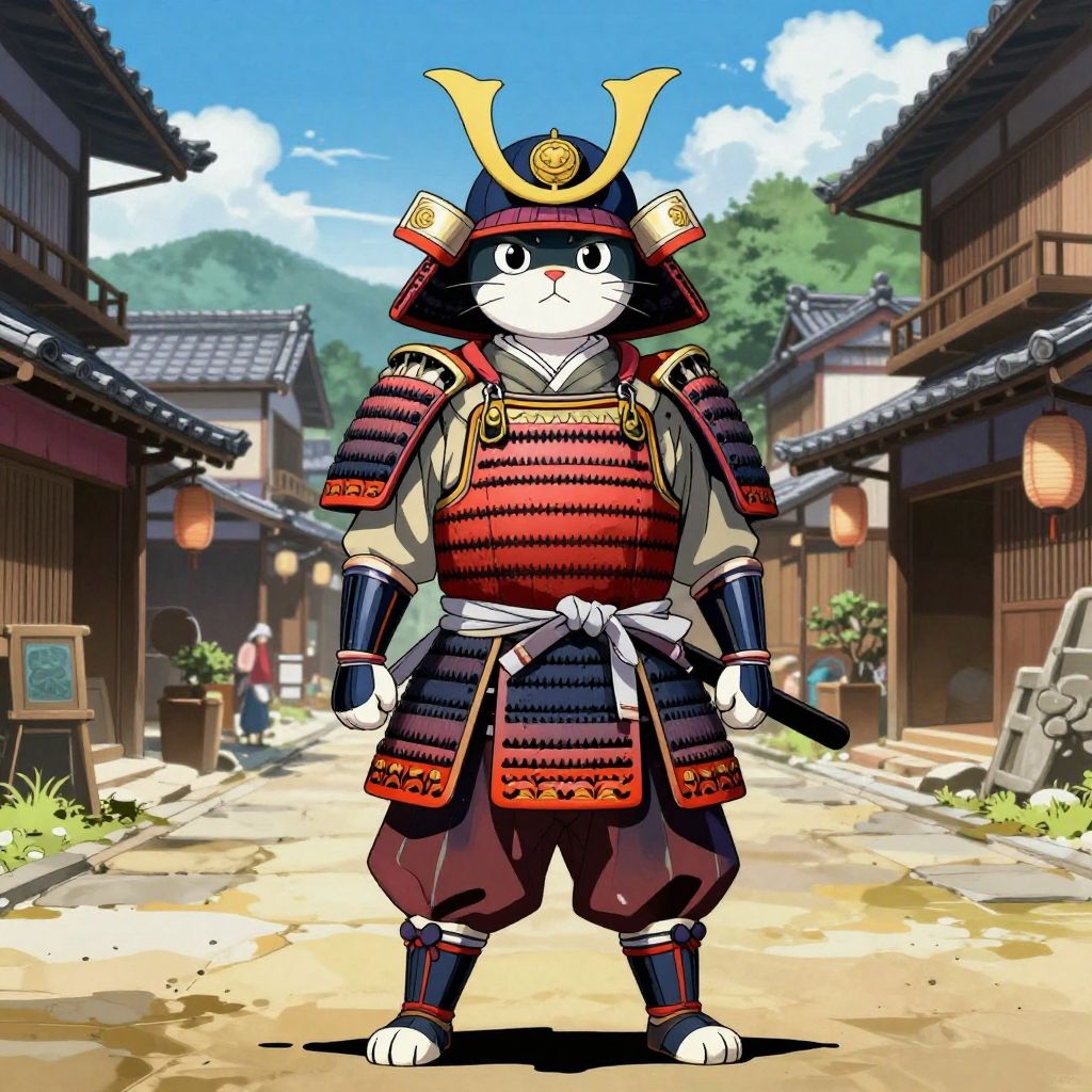 Toriyama cat wearing samurai armor, standing proud in a traditional Japanese village, intricate details, bold colors, dramatic shadows, anime-inspired character design